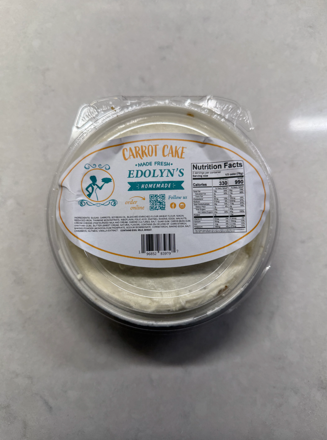 Sugar, carrots, soybean oil, bleached enriched flour (wheat flour, niacin, reduced iron, thiamine mononitrate, riboflavin, folic acid), eggs, food walnuts, leavening (baking soda), salt, cinnamon, cream cheese (pasteurized milk and cream, cheese culture, salt, carob bean gum), margarine (palm oil, soybean oil, water, salt, vegetable mono & diglycerides, soy lecithin, sodium benzoate [preservative], citric acid, natural flavor, beta carotene [color], vitamin A palmitate), butter (cream, salt), cornstarch, corn syrup, baking powder (sodium acid pyrophosphate, sodium bicarbonate, cornstarch, monocalcium phosphate), vanilla extract, nutmeg.